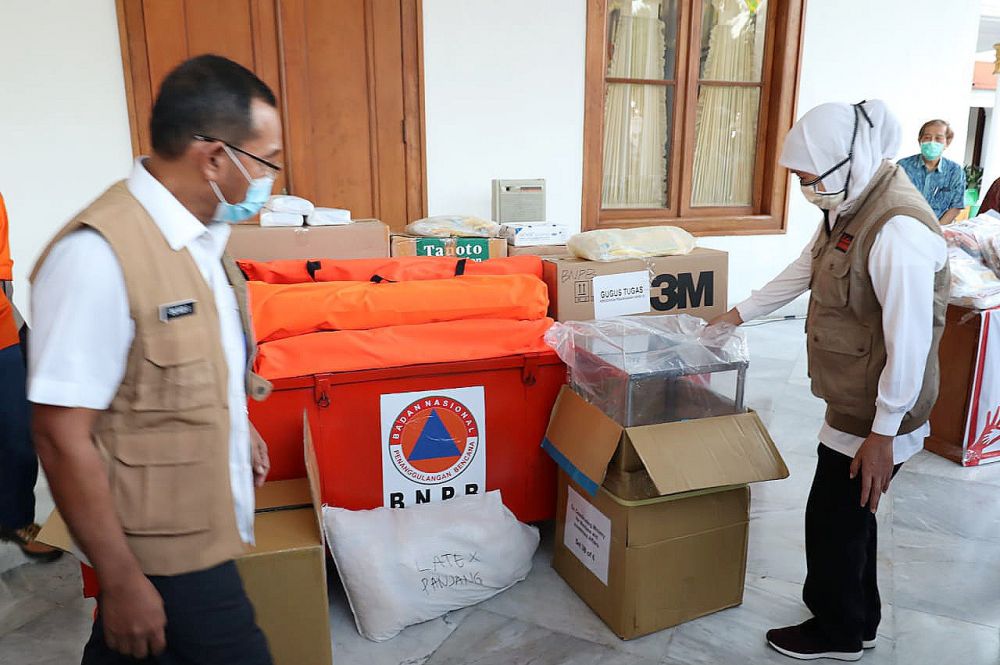 Bertempat di Gedung Negara Grahadi, Kamis (7/5) bantuan dari BNPB mulai reagen 20.000 pcs, ventilator sebanyak 3 unit, APD lengkap sebanyak 300 set, tenda isolasi sebanyak 3 set, tenda pengungsi sebanyak 20 set, velbed sebanyak 100 unit, hand scoon panjang sebanyak 1.000 pasang, swab kit sebanyak 1.000 pcs, dan rapid test sebanyak 10.000 psc diserahkan langsung pada Gubernur Jawa Timur Khofifah Indar Parawansa.