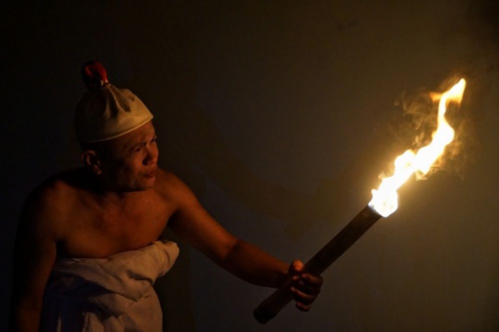 SURABAYA PAGI, SURABAYA - Ditengah Pandemi di Surabaya membuat pelaku seni gemas dan mengkritik kondisi tersebut melalui sebuah karya Polah Tanpa Aran bertakjuk Bendera Setengah Tiang yang dimainkan secara monolog oleh Meimura Teater Ragil Surabaya.Meimura, mementaskan monolognya dalam cerita Ritus Travesty didalam rumahnya, di kawasan Gunung Anyar, Surabaya, Jawa Timur, Sabtu (16/5/2020).