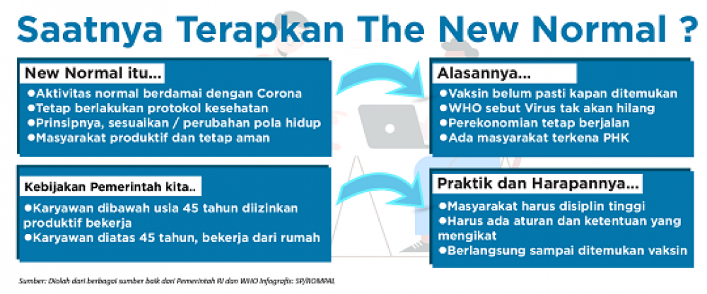 Sementara itu, seorang Psikologi Sosial & Kepribadian Fakultas Psikologi Universitas Airlangga Surabaya, Dr. Achmad Chusairi, MA melihat bahwa the New Normal merupakan respon lanjut dari upaya menghadapi penularan Covid-19. "Harus kita pahami new normal sebenarnya respon lanjutan dari upaya untuk menghadapi atau mengurangi penularan. Upaya ini jangan dianggap kontradiksi dengan upaya-upaya sebelumnya," jelasnya.