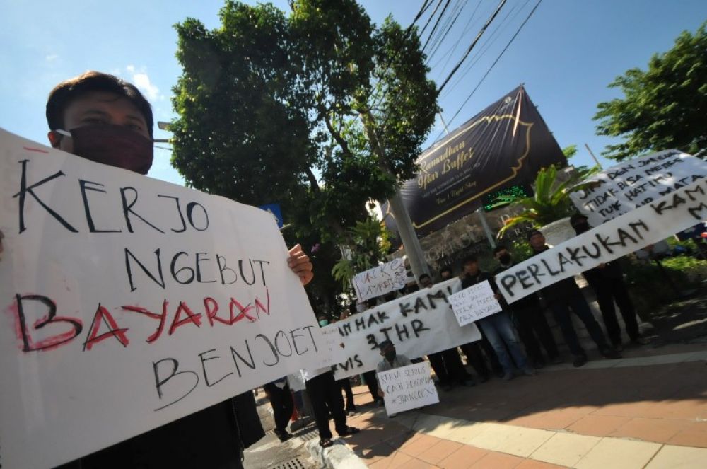 Puluhan karyawan Hotel Garden Palace Surabaya melakukan demo di depan Lobby Hotel Garden Palace Surabaya, Jawa Timur, Selasa (19/5/2020). Sebanyak 270 Karyawan tersebut berdemo menuntut Haknya di penuhi oleh Management Hotel Garden Palace Surabaya yang tak kunjing dibayar. SP/Julian
