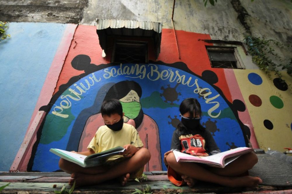 Anak belajar di depan mural bertuliskan "Pertiwi Sedang Bersusah" di kawasan Krukah Surabaya, Jawa Timur, Selasa (19/5/2020). Seni Melawan Pandemi itu menjadi gerakan street art untuk melawan pandemi melalui pesan-pesan karya jalanan. Gerakan mural serentak ini dilakukan akhir pekan lalu tanggal 16 Mei 2020. Ini diinisiasi oleh Serikat Mural Surabaya sebagai bagian dari movement untuk meramaikan kembali ruang publik dengan seni jalanan. SP/Julian