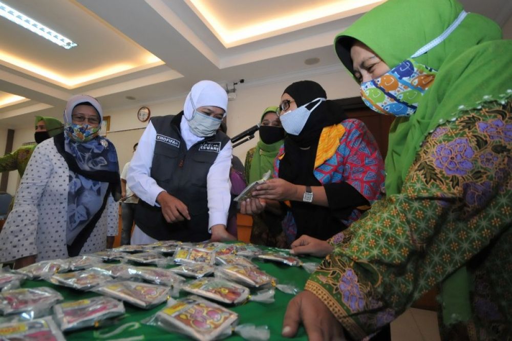 Alim Markus, selaku koordinir Paguyuban Masyarakat Tionghoa bersama Gubernur Jawa Timur Khofifah Indra Parawangsa saat melakukan donasi di kantor Muslimat NU Jalan A yani Surabaya, Jawa Timur, Rabu (20/5/2020). Paguyuban Masyarakat Tionghoa Indonesia di Jawa Timur bekerja sama dengan Muslimat NU, kembali menyalurkan berbagai sumbangan bagi masyarakat yang terdampak Covid-19. SP/Julian
