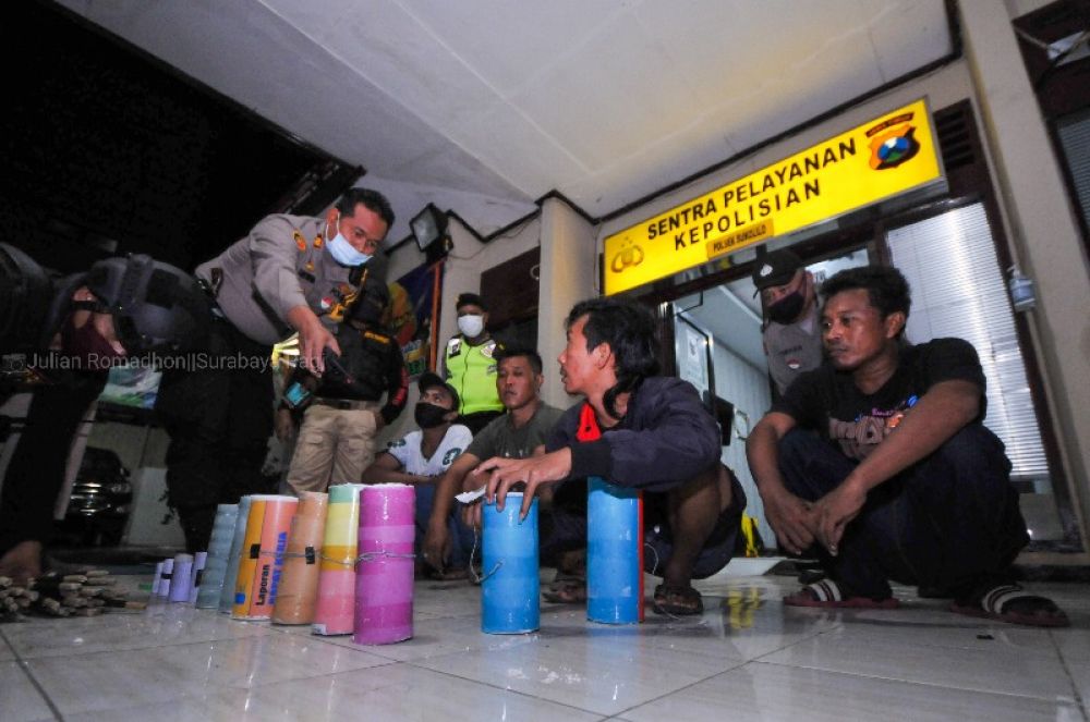 Petugas Tim Anti Bandit Polsek Sukolilo menangkap sebanyak 4 orang atas nama Abdul Kalim (29), Adimas ari (28), Sutoni (41), dan Sayful Anwar (38) diduga produksi mercon, kawasan Kejawan Gebang Surabaya, Jawa Timur, Sabtu (23/5/2020) malam. Puluhan mercon berbagai variasi ledakan itu disita petugas karena dinilai selama Ramadan mengganggu ketentraman dan kenyamanan warga beribadah di Surabaya. SP/Julian