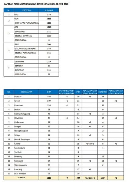 Dari jumlah tersebut, sebanyak 37 orang sudah dinyatakan sembuh, dan 21 orang meninggal. Sisanya, 161 orang kini sedang dalam perawatan di beberapa rumah sakit di Gresik, Surabaya dan Sidoarjo.