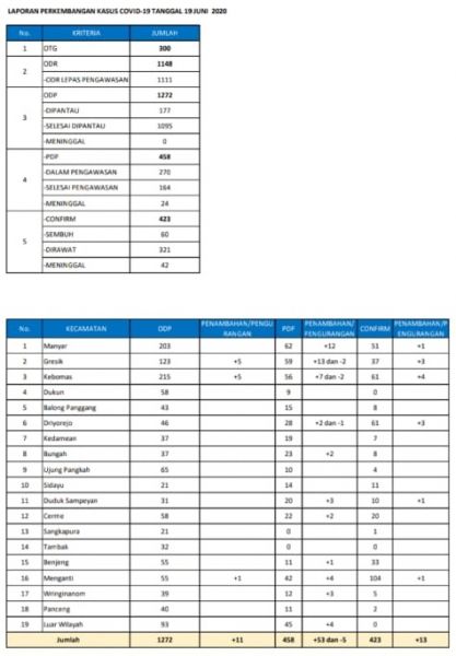 Tercatat hingga 19 Juni 2020 ada 458 PDP di Gresik. Sebanyak 270 orang dalam pengawasan, 160 orang selesai pengawasan. Dan sebanyak 27 orang meninggal dunia. did