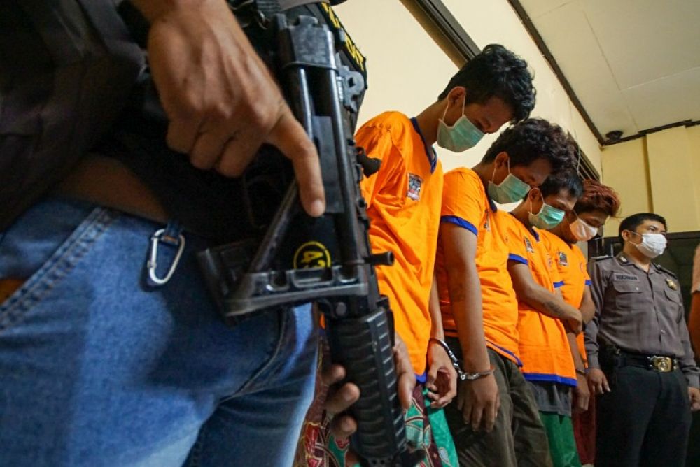 Kapolsek Wonokromo Kompol Cristopher Adikara Lebang bersama empat tersangka dan barang bukti saat gelar persrilis di Mapolsek Wonokromo, Surabaya, Jawa Timur, Selasa (23/6/2020). Niat Suprambodo (27), menikmati narkoba jenis sabu-sabu terpaksa gagal. Warga Jalan Bumiarjo itu ditangkap bersama tiga tersangka lain. Mereka Andrew Rahmat Prasetyo (27), dan Noval Rahmat (19), warga Jalan Jagir Sidomukti; serta Bambang Irawan (29), warga Jember. Mereka diamankan saat asik mengonsumsi narkoba jenis sabu-sabu di rumah jalan Ngagel Baru II, Rabu (11/6)malam. SP/Julian