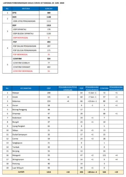 Dengan perubahan data hari ini maka total warga Gresik yang terpapar Covid-19 menjadi 534 orang.
