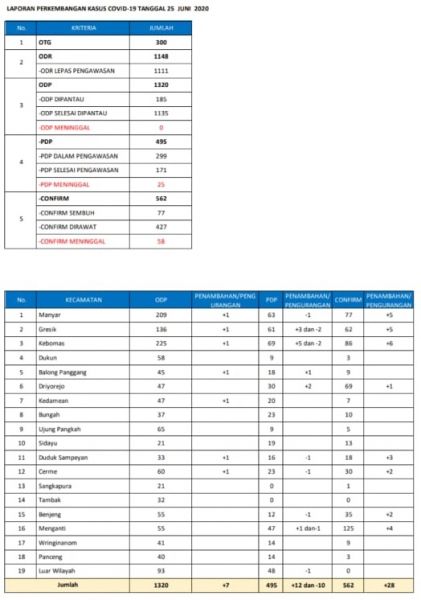 Dengan update ini maka total warga Gresik yang terpapar oleh virus asal Kota Wuhan, China sudah mencapai 562 orang.