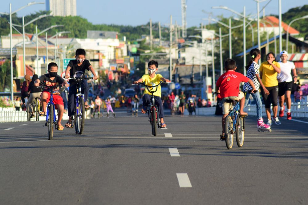 Pesepeda melintasi Jembatan Suroboyo di Pantai Kenjeran, Surabaya, Jawa Timur, Minggu (28/6). Jembatan Suroboyo menjadi ikon untuk menikmati sunset serta bersepeda di masa transisi era New Normal menjadi tren bagi masyarakat Surabaya memanfaatkan waktu akhir pekan untuk bersepeda maupun aktivitas lari santai (jogging) guna menjaga kesehatan ditengah pandemi Covid-19. SP/Patrik Cahyo