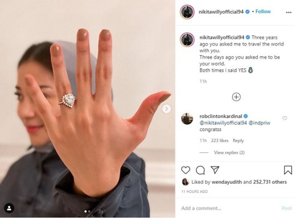 Nikita Willy lantas membubuhkan caption dalam unggahannya. Ia terlihat mengingat momen di mana tiga tahun yang lalu, Indra Priawan mengajaknya untuk keliling dunia, lalu tiga hari yang lalu ia dilamar sang kekasih. "Three years ago you asked me to travel the world with you. Three days ago you asked me to be your world. Both times i said YES," tulisnya.