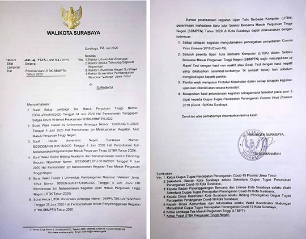 Hal itu tertuang dalam Surat Wali Kota bernomor 421.4/5853/436.8.4/2020 yang ditanda tangani langsung oleh Tri Rismaharini tanggal 2 Juli 2020. Surat tersebut langsung dikirimkan kepada Rektor Unair, Rektor ITS, Rektor Unesa dan Rektor UPN mengenai pelaksanaan UTBK yang harus memenuhi ketentuan sebagai berikut: