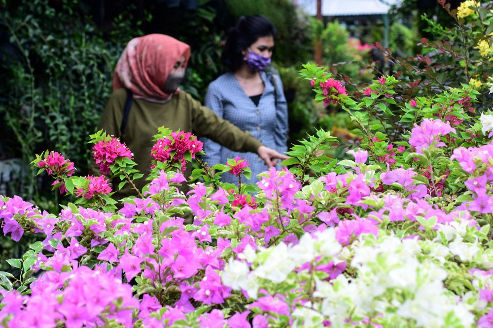 Pengunjung memilih bibit bunga di kios pedagang bibit tanaman di Pasar Bunga Bratang, Surabaya, Jawa Timur, Minggu (5/7). Masa pandemi Covid-19 memasuki era new normal membuat masyarakat memiliki banyak waktu berada di rumah, waktu luang ini bagi pencinta tanaman dimanfaatkan untuk kegiatan berkebun. Berkebun menjadi sarana mengurangi rasa bosan sekaligus mampu menciptakan ketahanan pangan dalam skala kecil bagi keluarga.SP/Patrik Cahyo