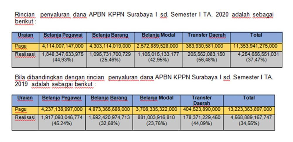Sedangkan Penyaluran Dana APBN pada Satuan Kerja K/L wilayah pembayaran KPPN Surabaya I, yang meliputi Kota Surabaya dan Kabupaten Gresik, mencapai sebesar Rp. 4,2 trilyun dari total pagu DIPA TA. 2020 sebesar Rp. 11,3 trilyun.