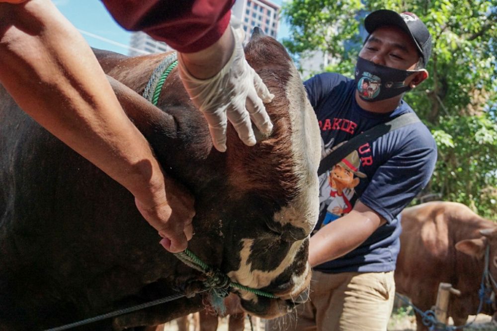 Petugas Dinas Ketahanan Pangan dan Pertanian (DKPP) Kota Surabaya memeriksaan kesehatan hewan ternak menjelang Hari Raya Idul Adha di Jalan Mayjend Sungkono, Surabaya, Jawa Timur, Senin (13/7/2020). Sebanyak 70 hewan kurban telah diperiksa dan semuanya sehat. SP/Julian