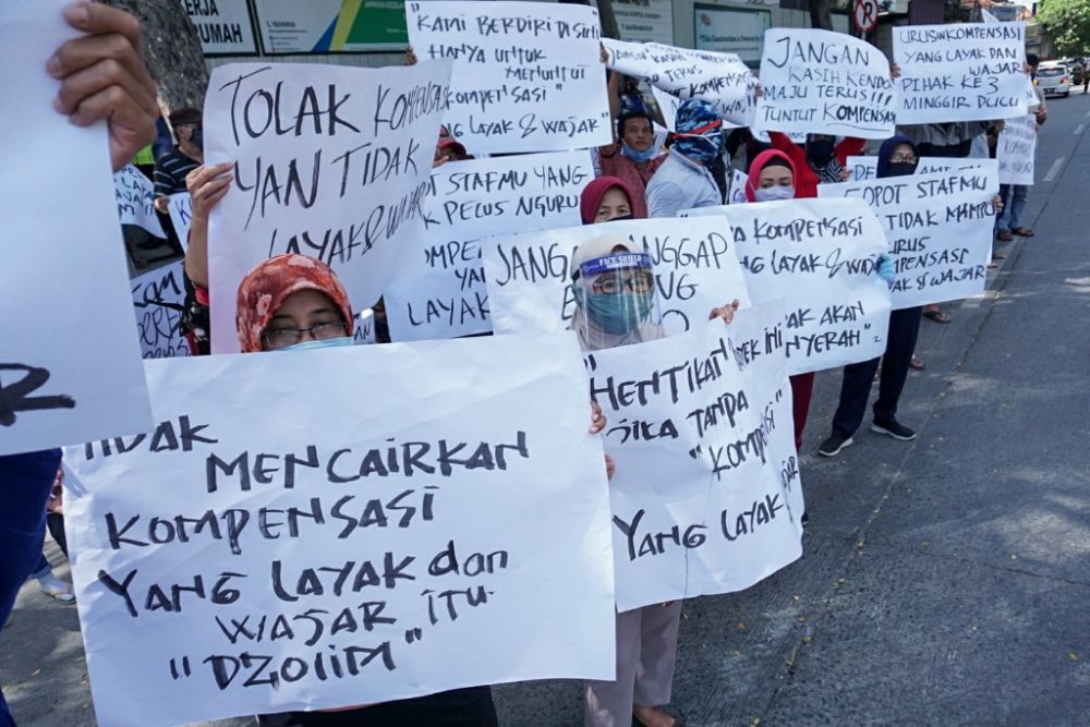 Sejumlah massa dari warga Wonokitri Besar Surabaya, melakukan unjuk rasa di depan proyek pembangunan rumah sakit Mayapada di Jalan Mayjend Sungkono, Surabaya, Jawa Timur, Senin (13/7/2020). Ratusan warga ini menuntut agar pihak Mayada segera memberikan kompensasi yang sudah dijanjikan sejak tahun lalu. Proyek tersebut mengakibatkan beberapa rumah warga yang terdampak, yakni mengalami retak-retak dan mengganggu ketenangan warga sekitar. SP/Julian