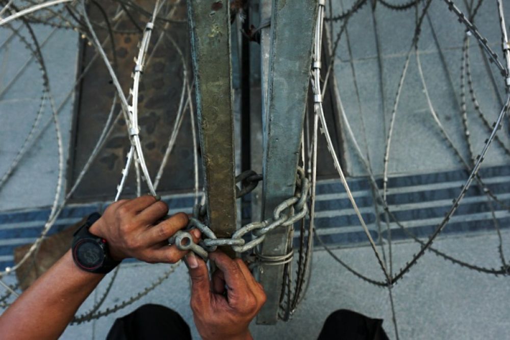 Sejumlah anggota kepolisian memasang barrier di depan Kantor KPU Kota Surabaya, Jawa Timur, Kamis (23/7/2020). Sejumlah anggota polisi akan disiagakan di sekitar kantor KPU Kota Surabaya menyusul rencana Verifikasi KTP calon perseorangan dalam Pilkada Surabaya 2020. Verifikasi KTP yang akan berlangsung Sabtu (25/7/2020) mendatang. SP/Julian
