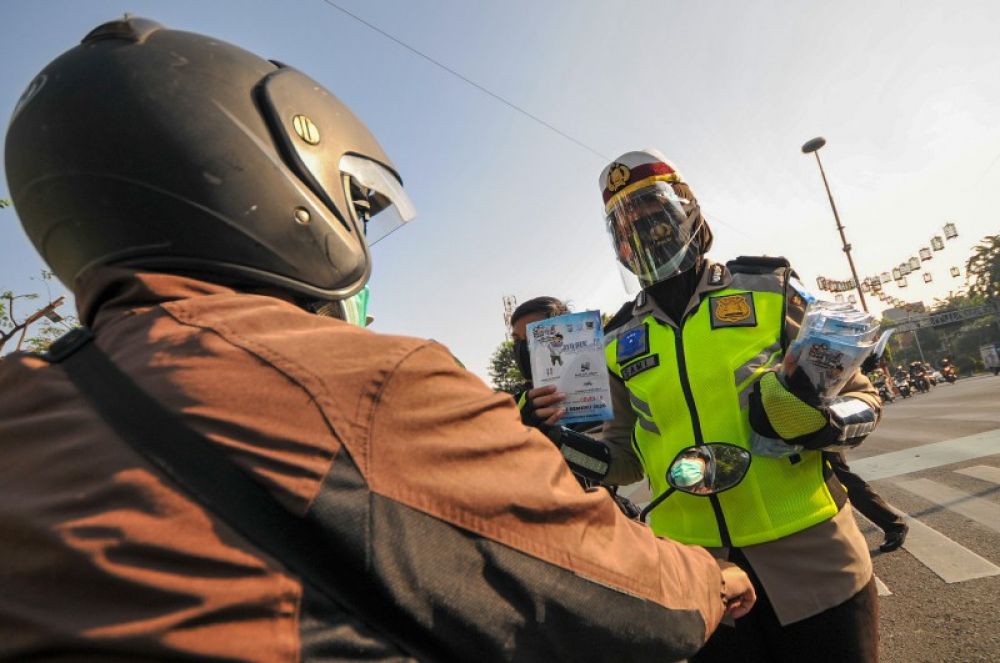 Ditlantas Polda Jatim bersama Satlantas Polrestabes Surabaya, Menggelar operasi patuh semeru 2020 di perapatan Jalan Polisi Istimewa Surabaya, Jawa Timur, Rabu (29/7/2020). Operasi kali ini digelar saat masa pandemi virus corona covid 19, dalam kesempatan ini ditlantas polda jatim bersama Satlantas Polrestabes Surabaya memanfaatkan momen untuk menekan pentingnya patuh protokol kesehatan kepada masyarakat. Tak hanya sosialisasi terkait pentingnya protokol kesehatan petugas juga melakukan membagian ratusan masker ke pengguna jalan. SP/Julian
