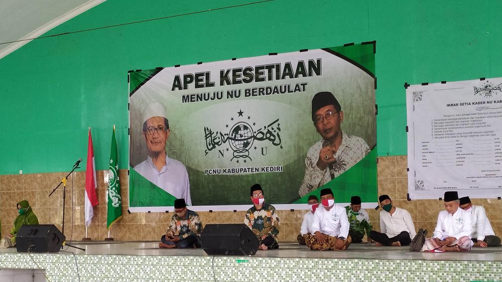 Kegiatan apel kesetiaan dan pembacaan ikrar digelar di Gedung Serbaguna NU Kabupaten Kediri, Minggu (2/8/2020). Acara dimuli dengan menggelar upacara yang dipimpin Ketua PCNU Kabupaten Kediri, H. Muhammad Makmun dari Pondok Ploso Kabupaten Kediri. Acara berjalan sesuai protokol kesehatan.