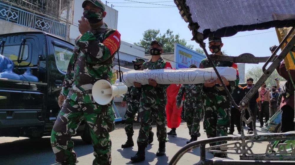 Dan yang menarik, mereka membawa boneka replika berbentuk pocong dengan bertuliskan 'Korban Covid-19'. Kemudian seorang anggota TNI memasang masker kepada masyarakat yang melintas di Pasar Tradisional Citra Niaga (Pasar Legi) Jombang tidak memakai masker.