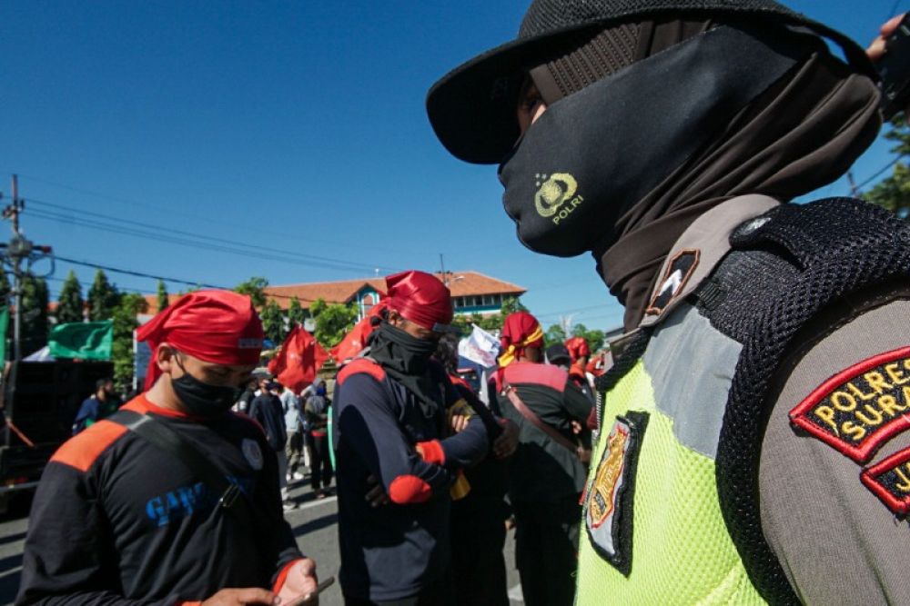 Ribuan massa tergabung dalam Konfederasi Serikat Pekerja Indonesia (KSPI) Jawa Timur, berdemo di depan gedung DPRD Jawa Timur, Selasa (25/8/2020). Para buruh tersebut melakukan aksi demonstrasi serentak untuk menolak draft omnibus law RUU Cipta Kerja yang diserahkan pemerintah kepada DPR. SP/Julian