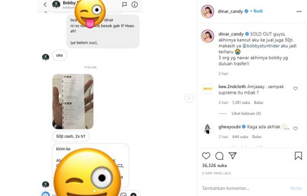 Dinar Candy mengatakan masih ada dua celana dalam lagi yang akan dijualnya. Bagi yang berminat bisa langsung menghubungi Dinar Candy melalui Direct Message (DM) Instagram dan WhatsApp bisnisnya.