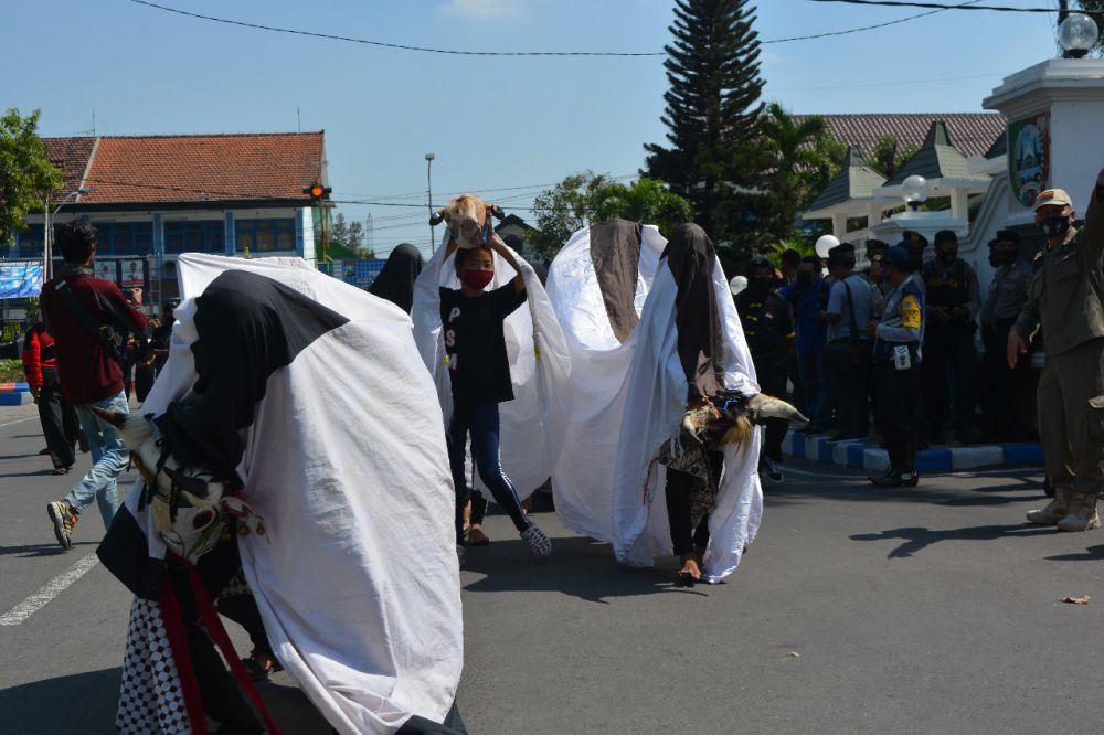 SURABAYAPAGI.com, Jombang - Ratusan seniman kuda lumping dan bantengan menggelar aksi unjukrasa di kantor dewan kesenian dan kantor Bupati Jombang, Jawa Timur, pada Senin, (21/9/2020).
