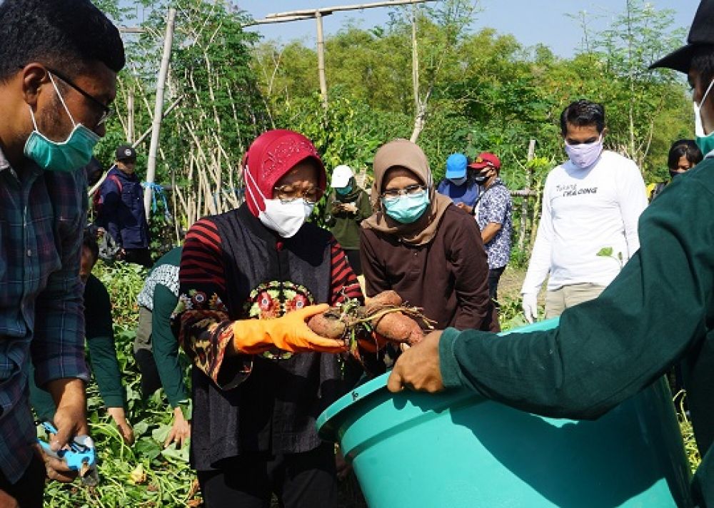 SURABAYAPAGI, Surabaya - Wali Kota Surabaya Tri Rismaharini bersama jajarannya panen raya Ketela Rambat Madu, Ketela Pohon, hingga panen Lele besar di lahan bekas tanah kas desa (BTKD) Kelurahan Jeruk, Kecamatan Lakarsantri, Surabaya, Rabu (23/9/2020). Saat itu, ia mencabut satu persatu Ketela Rambat Madu itu dan sesekali dibantu langsung oleh jajaran Dinas Ketahanan Pangan dan Pertanian (DKPP).