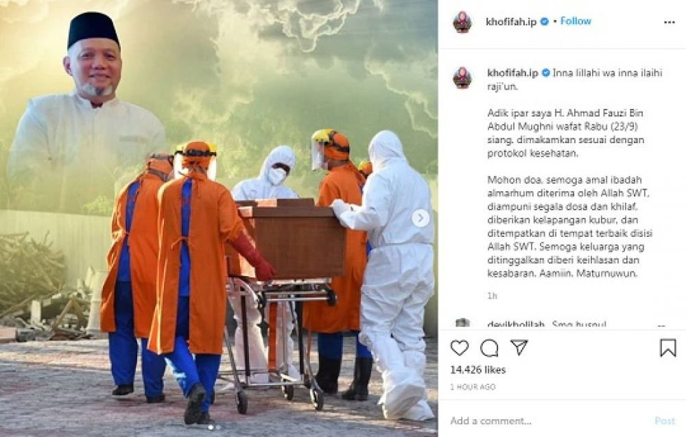 Khofifah pun meminta doa kepada warganet untuk almarhum adik iparnya itu."Inna lillahi wa inna ilaihi raji'un. Adik ipar saya H.Ahmad Fauzi Bin Abdul Mughni turut meninggal akibat Covid-19,Rabu (23/9) siang.