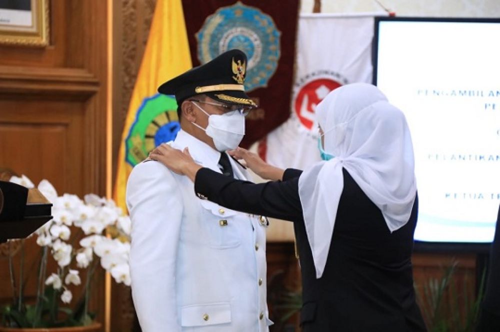 SURABAYAPAGI, Surabaya - Kepala Biro Administrasi Kesejahteraan Sosial Sekretariat Daerah Provinsi Jatim, Hudiyono, resmi dilantik menjadi Penjabat (Pj) Bupati Sidoarjo oleh Gubernur Jatim Khofifah di Gedung Negara Grahadi, Kamis (1/10/2020).