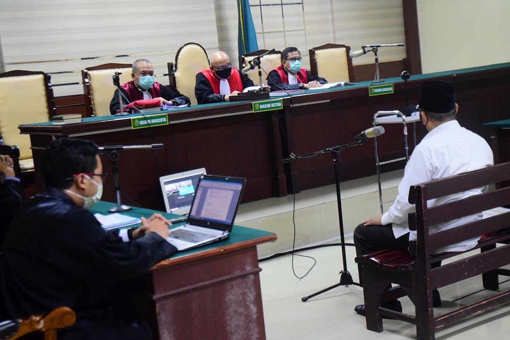 Berlangsungnya persidangan yang diikuti Bupati nonaktif Sidoarjo dengan mengenakan setelan pakaian baju panjang putih, celana panjang hitam dan memakai peci berada di dalam ruang persidangan mendengarkan langsung putusan oleh Majelis Hakim.