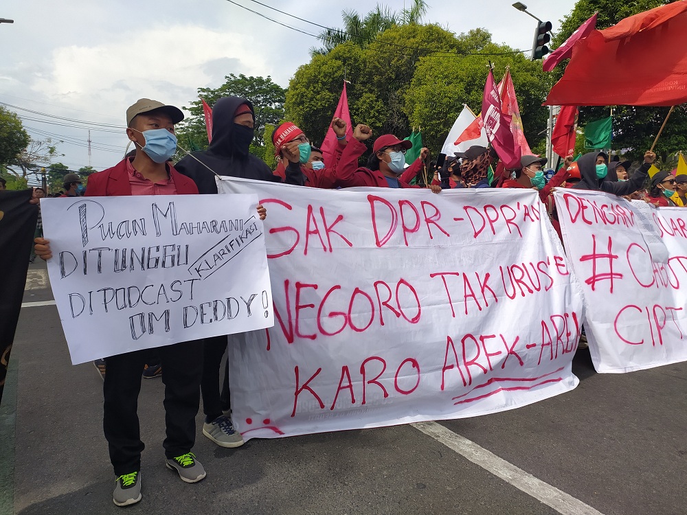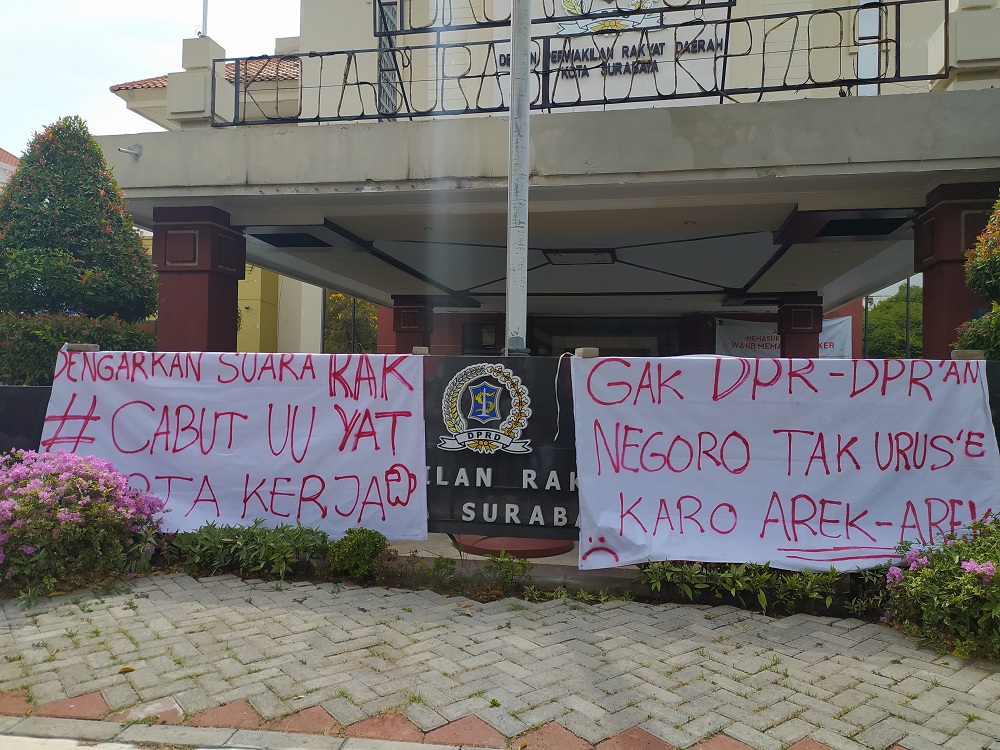 Beberapa aksi demo juga memasang spanduk di depan gedung DPRD Kota Surabaya sebagai salah satu buntut kekecewaan para aksi demo.