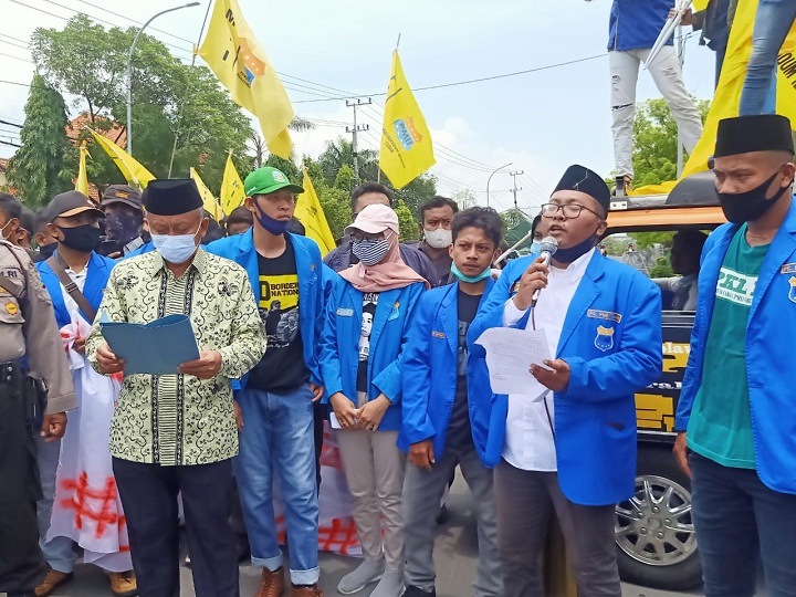 "PMII Tuban dengan tegas menolak RUU Omnibuslaw untuk disahkan menjadi undang- undang," teriak orator sekaligus ketua PMII Tuban, M. Chanif Muayyad.