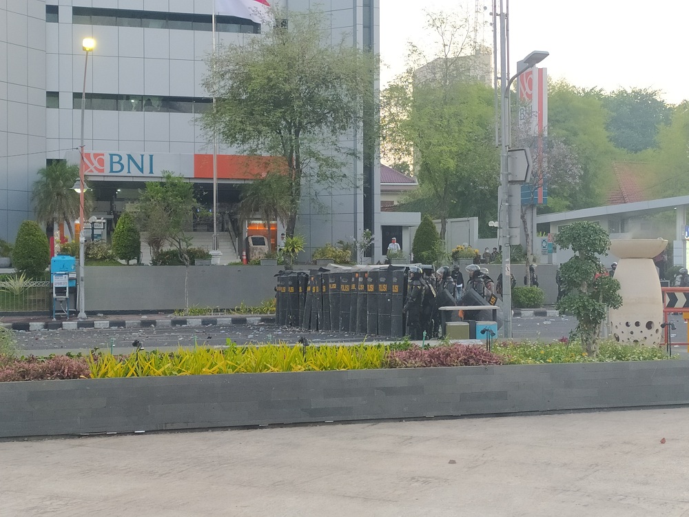 Sampai dengan pukul 17. 30 aparat kepolisan masih berusaha meredam aksi massa di Jl. Panglima Sudirman dan Jl. Pemuda Surabaya. Byt