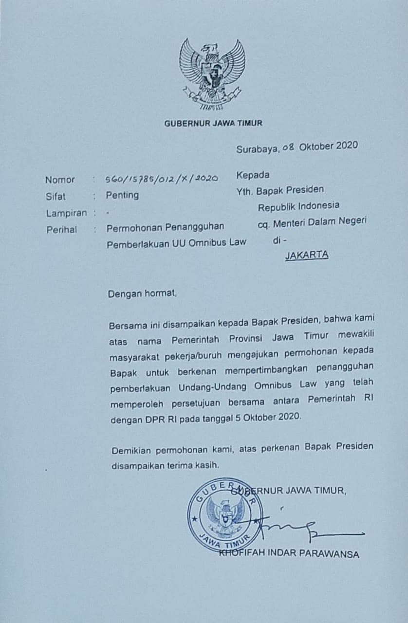 Caption : Surat Permohonan Penangguhan Pemberlakuan UU Omnibus Law