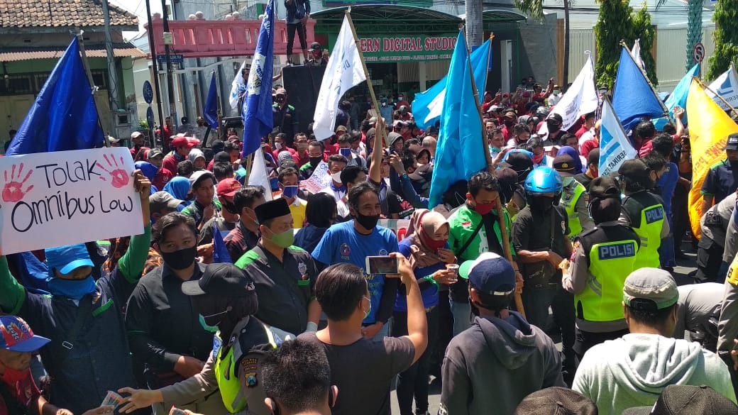 SURABAYAPAGI.com, Jombang - Aksi unjuk rasa menolak UU Omnibus Law Cipta Kerja masih berlanjut. Kali ini ratusan massa buruh melakukan aksinya didepan gedung DPRD Jombang, Jawa Timur.