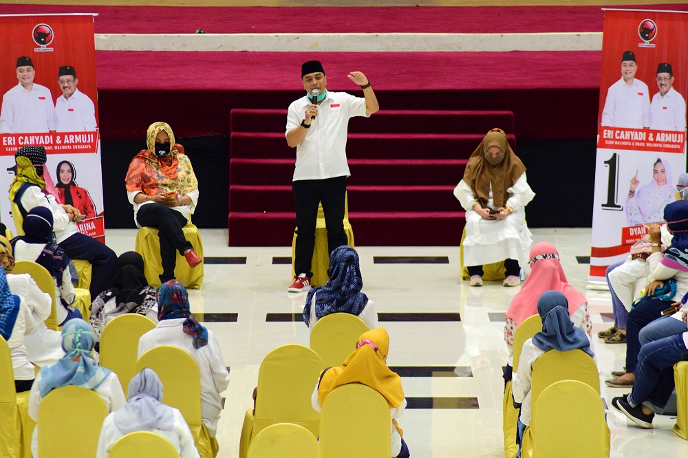 SURABAYAPAGI, Surabaya - Calon Wali Kota Surabaya, Eri Cahyadi menghadiri pertemuan dengan Ketua Paguyuban Bunda Paud se - kecamatan Kota Surabaya di Graha Unesa, pada Minggu (18/10/20).