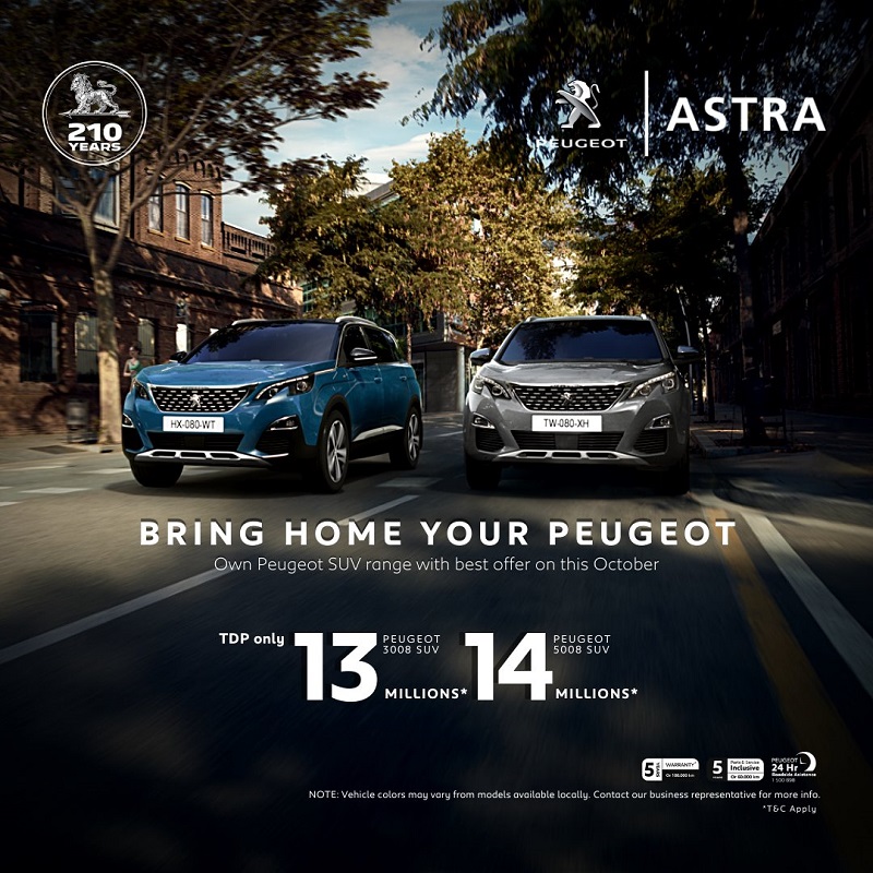 SURABAYAPAGI.com, Jakarta - Bulan Oktober ini, Astra Peugeot menawarkan berbagai paket kredit yang sangat spesial untuk publik. Paket bertajuk “Bring Home Your Peugeot” mampu memberikan alternatif bagi konsumen Tanah Air. Momen ini menjadi saat yang tepat untuk membeli line up SUV Peugeot, 3008 dan 5008, Senin (19/10/2020).