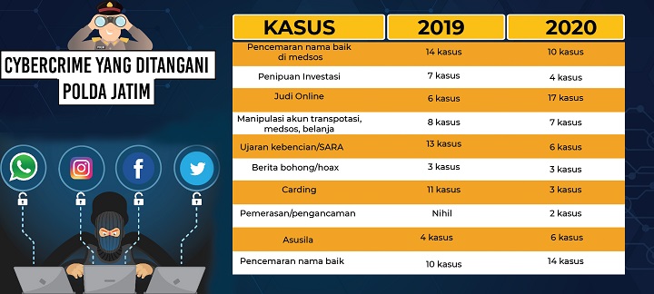 Terkait penanganan kejahatan cyber ini, Kasubdit V Cybercrime Ditreskrimsus Polda Jatim, AKBP Catur C Wibowo menegaskan, penggunaan hanphone dan alat komunikasi lain sering dibarengi dengan tindakan pidana. Terbukti, selama tahun 2019 hingga 2020 banyak kasus yang berhasil diungkap jajarannya.