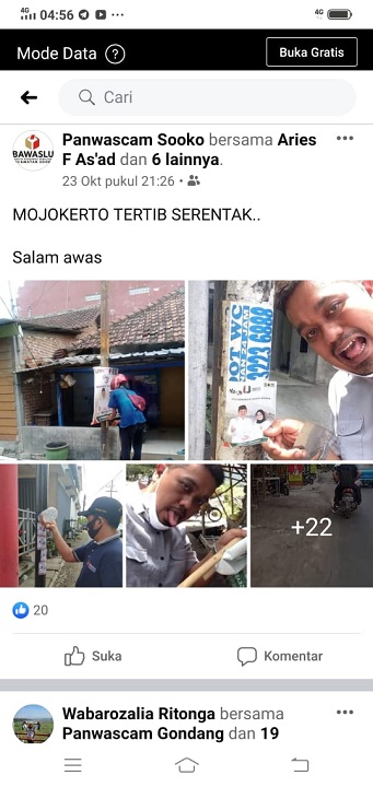 Ini setelah beredar foto 'provokatif' dari salah satu petugas penertiban saat mencopot paksa stiker, baliho dan spanduk pasangan calon (paslon) yang melanggar aturan di akun facebook milik Panwascam Sooko.