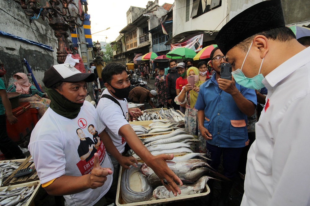 SURABAYAPAGI, Surabaya - Calon Wali Kota Surabaya, Eri Cahyadi mengunjungi Pasar Pabean Surabaya, guna mendengar aspirasi para pedagang Pasar Pabean, yang tidak ingin digusur pada beberapa titik tertentu di wilayah pasar, Senin (26/10/20).