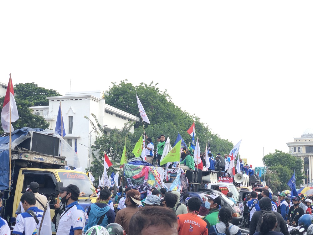 "Kembalikan kejayaan para buruh, kasihan anak kami, kasihan cucu kami, kasihan keluarga kami," suara lantang yang terdengar dari speaker orator.