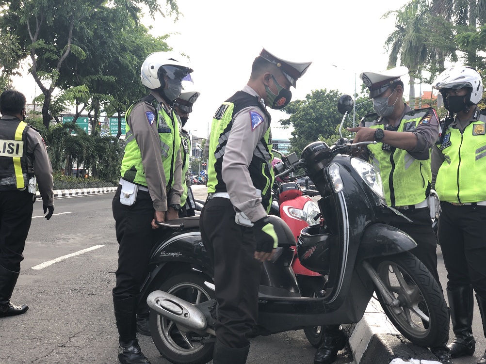 Caption : Pihak kepolisian mengamankan kendaraan bermotor agar tidak mengganggu laju kendaraan di Jl. Pahlawan, Surabaya