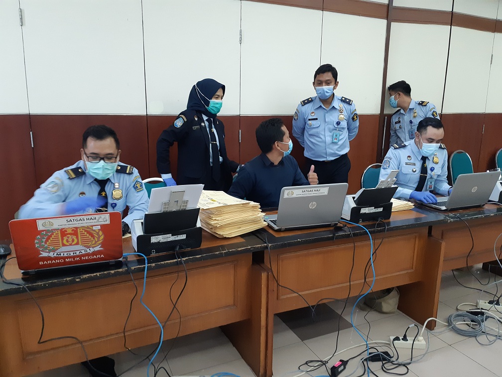 Caption : Petugas Imigrasi tetap menerapkan protokol kesehatan sebagaimana mestinya. . SP/ Mochammad Kasyfi Fahmi