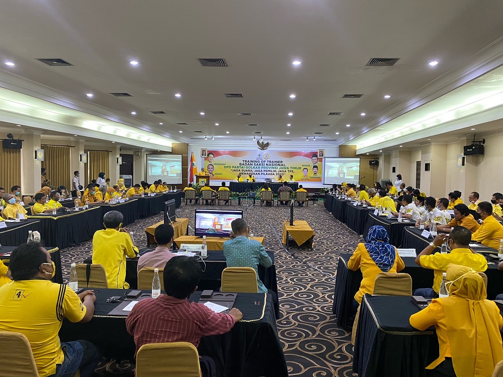 SURABAYAPAGI, Surabaya - Partai Golkar Jawa Timur menggelar Training of Trainer (TOT) Badan Saksi Nasional, Rabu-Kamis (4-5/11/2020) di Surabaya. Bertema "Jaga Suara, Jaga Pemilih, Jaga TPS, Menangkan Pilkada 2020" acara ini diikuti perwakilan dari 19 kabupaten/kota.
