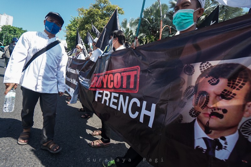 Ribuan masa aksi bela Rasulullah geruduk Gedung Negara Grahadi Surabaya, Jawa Timur, Jumat (6/11/2020). Mereka mengecam pernyataan Presiden Prancis Emmanuel Macron yang dianggap menghina Islam. SP/Julian