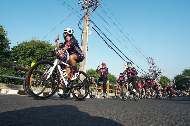 Sejumlah Mitra Outlet dan Distributor mengikuti Gowes Bareng Mitra Outlet dan Distributor (Gasbro) 2020 di Surabaya, Jawa Timur, Sabtu (7/11/2020). Gowes Bareng Mitra Outlet dan Distributor (Gasbro) 2020 Adalah kegiaatan fun bike, yang bertujuan mengingatkan pentingnya protokol kesehatan untuk berolah raga di masa pandemi Covid-19 yang tak kunjung usai. SP/Julian