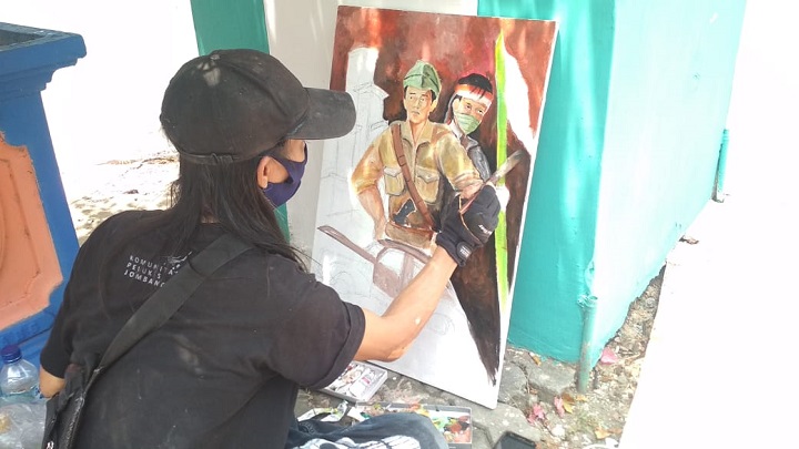 Seperti halnya yang dilakukan oleh Komunitas Pelukis (KOPI) Jombang. Mereka berkreasi membuat lukisan secara bersama-sama dengan tema Hari Pahlawan dan pandemi Covid-19.