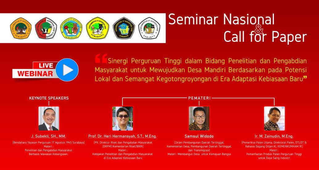 SURABAYAPAGI.com, Surabaya - Universitas 17 Agustus 1945 (Untag) Surabaya menyelenggarakan Seminar Nasional dan Call for Paper. Acara ini mengusung tema “Sinergi Perguruan Tinggi dalam Bidang Penelitian dan Pengabdian Masyarakat untuk Mewujudkan Desa Mandiri Berdasarkan pada Potensi Lokal dan Semangat Kegotong-royongan di Era Adaptasi Kebiasaan Baru”. Selasa (10/11/2020).