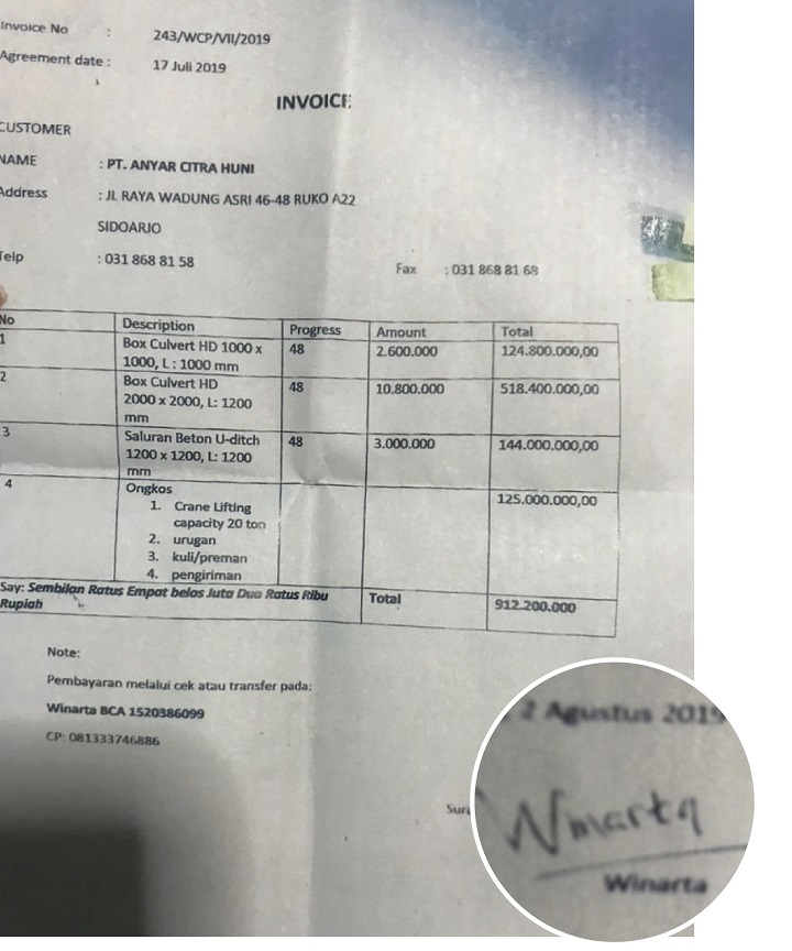 Selain jaminan beberapa sertifikat, juga invoice dari beberapa rekanan. Saat kasus ini terungkap, Allan baru dikucuri kredit Rp 17 miliar. Dalam ajuan kredit ini, Allan mencantumkan invoice No 243/WCP/VII/2019, tertanggal 17 Juli 2019. Invoice tagihan box culvert, beton U-ditch dll dengan total sebesar Rp 912 juta, dibuat oleh Winarta, beserta tandatangannya.