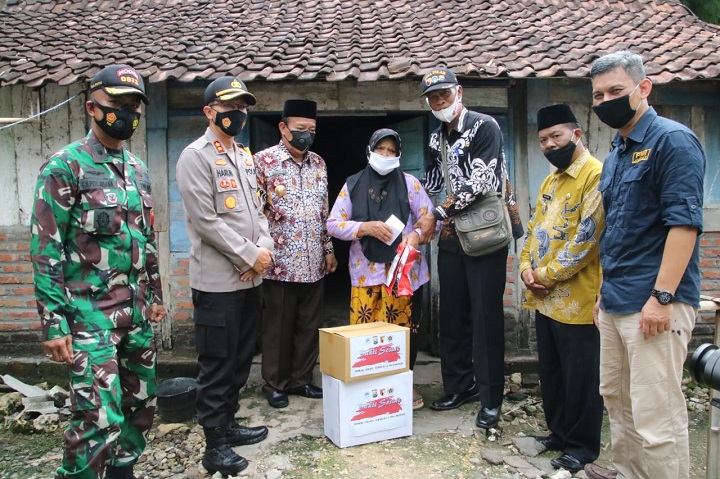 Usai acara seremonial pembagian paket sembako di Kantor Desa, Bupati bersama Kapolres, Kasdim dan PWI memberikan bantuan paket sembako dan bantuan sejumlah uang ke masyarakat kurang mampu dan langsung diberikan ke rumahnya. jir